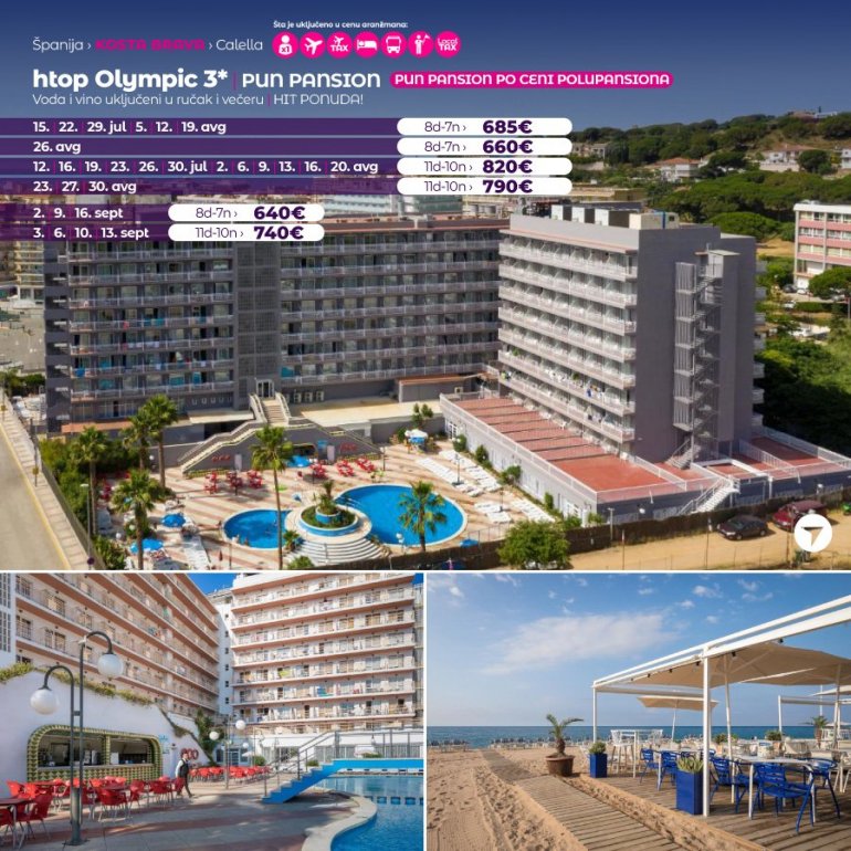 Овај објекат је удаљен 5 мин хода од плаже. Смештен на 300 метара од плаже Калеља, објекат htop Olympic #htopEnjoy поседује 3 отворена базена за одрасле и децу. Све собе имају клима-уређај, сопствени балкон или терасу и ТВ са сателитским каналима. У хотелу H TOP Olympic се организује бесплатан програм активности за децу узраста до 12 година, који је на располагању 6 дана у недељи. Доступни су базен за малу децу и игралиште. У ресторану са услугом на бази шведског стола служе се јела каталонске, шпанске и интернационалне кухиње. У оквиру објекта налази се и бар. Вечерњи забавни програм укључује живу музику и кабаретске представе. Гостима је доступна бесплатна услуга превоза до оближњих хотела из ланца Х Топ (хотел нуди услугу само у јеку сезоне, за више информација контактирате објекат). Хотел H TOP Olympic се налази у Калељи, на Коста дел Марезме. Аеродром Ђирона удаљен је 32 км. Барселона се налази на нешто више од 40 км.