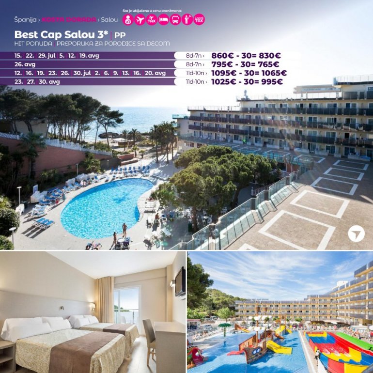 Овај хотел се налази поред мора у заливу Кап Салоу, на Цоста Доради. Хотел Best Cap Salou поседује спа центар и базен на отвореном. Све собе имају намештен балкон и бесплатан WиФи. Сеф је доступан на захтев. Хотел Best Cap Salou такође нуди фитнес и спа центар, као и тематски плитки базен за децу са тобоганима и играма у води. Домаћа и интернационална јела служе се на бази шведског стола у ресторану са кухињом отвореног типа. Хотелски снек бар ради од јуна до септембра.