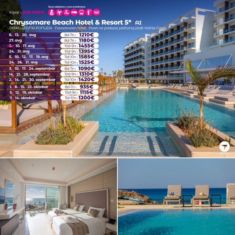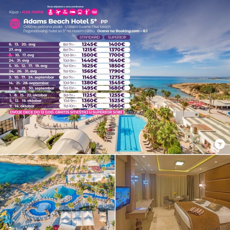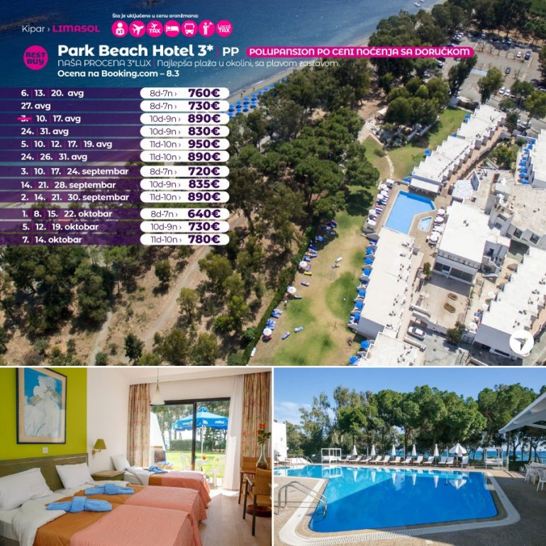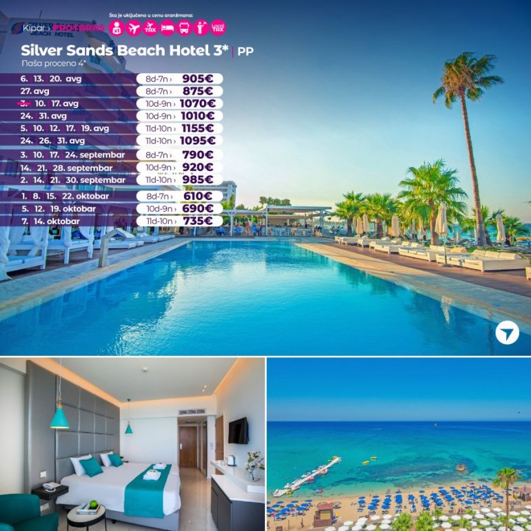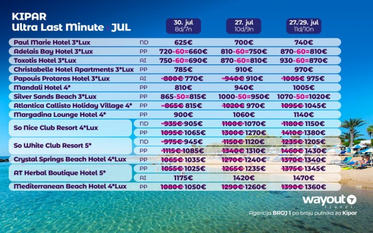Дефинитивно нова омиљена летња дестинација наших туриста, свакако јесте рајско острво Кипар. Осетите чари Медитерана, фантастичних плажа, веома квалитетних хотела, изузетне гастрономске понуде, као и незаборавног ноћног провода. За наше путнике смо спремили одличну фирст минуте понуду са пажљиво изабраним хотелима, како на основу пређашњих искустава наших клијената, тако и на основу одличних оцена на туристичким порталима.