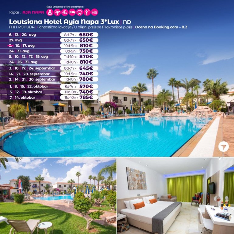 Овај објекат је удаљен 6 мин хода од плаже. Ови апартмани у породичном власништву налазе се на мирној локацији, недалеко од динамичне Аја Напе. Представљају пријатну и опуштајућу базу, са обиљем рекреативних садржаја. Пространи, у потпуности климатизовани апартмани Loutsiana Deluxe садрже велики балкон или терасу и бесплатан WiFi. Поједине смештајне јединице садрже потпуно опремљену чајну кухињу са електричним кувалом, фрижидером и тостером. Такође укључују простор за седење са ЛЦД ТВ-ом. Сеф је доступан уз доплату. Велики базен има хидромасажни део и окружен је предивним вртом. Потрошите енергију у новој теретани или уживајте у партији билијара у играоници. Када вам се отвори апетит, можете да уживате у разноврсним интернационалним и локалним специјалитетима и лаганим оброцима у ресторану поред базена који ради готово током целог дана.