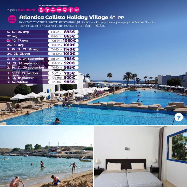 Callisto је комплекс осмишљен као копија традиционалног медитеранског села са белим двоспратним вилама плавих шалона, прозора и врата. Виле су окружене егзотичним дрвећем и цвећем, повезане узаним стазама са централним делом хотела, у коме се налази ресторан, рецепција, безени и пролаз до прелепе пешчане плаже. Идеалан избор за породице са децом и све остале који уживају у раскошној природи, а на неколико минута хода од главне улице познатог летовалишта Аја Напа. Центар града удаљен је 1,5км. Бесплатан улаз у аква парк недалеко од хотела!