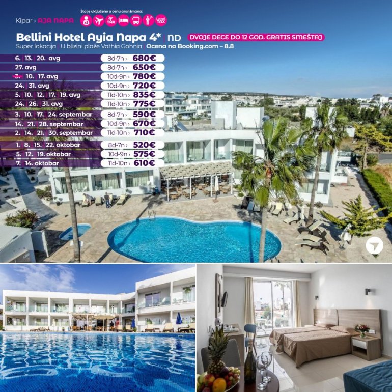 Потпуно реновиран хотел Bellini Ayia Napa је смештен у Авенији Ниси (Nissi Avenue), у срцу Аја Напе (Ayia Napa). У понуди има изванредно уређене апартмане. Осим тога, нуди студије и суите јединице које се налазе око приватног базена, бара и ресторана. Плаже Пернера и Сенди Беј (Sandy Bay) удаљене су око 500 метара од објекта. Плажа Ниси (Nissi Beach) је удаљена 2 км, а Аква парк Waterworld 3 км.
