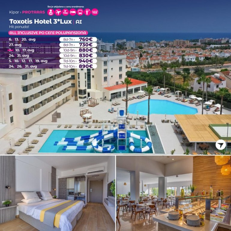 Одличан хотел, лоциран недалеко од центра Протараса, на најлепшем делу дугачке пешчане плаже. Од садржаја хотел има ресторан, бар, спољашњи базен, дечији базен, тениски терен, теретану, анимацију током дана и вечери, музички програм. Све собе су климатизоване, имају ТВ, фен, телефон, а уз доплату могу се користити фрижидер, сеф и wi-fi интернет.