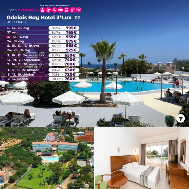 Хотел Adelais Bay удаљен је 500м од плаже Green bay, плажа која се налази између чувене Fig Tree плаже и Konnos плаже. Хотелски простор покрива велика башта са отвореним базеном. Собе су климатизоване са САТ ТВ и балконом или терасом. Свака соба поседује сопствено купатило са феном за косу. У саставу хотела је Аурора ресторан и бар Ilios поред базена. Опремљен је са игралиштем на отвореном са столицама за љуљање и играоницом, док се уз доплату може обезбедити услуга чувања деце. Град Protaras удаљен је од хотела 15 минута хода.