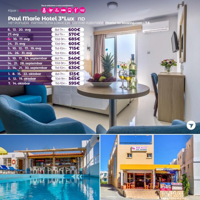 Објекат Paul Marie Hotel Apartments је смештен у центру летовалишта Аја Напа и располаже рестораном и кровним базеном на отвореном. WiFi је доступан у заједничким просторијама. Студији и апартмани у објекту Paul Marie Hotel садрже простор за седење и балкон са погледом на врт. Осим тога, имају чајну кухињу са плочама за кување и посуђем. Купатила у смештајним јединицама су опремљена феном за косу и тушем. Објекат Paul Marie Hotel Apartments такође нуди снек бар и рецепцију која ради нон-стоп. Међународни аеродром Ларнака је удаљен око 60 км. Понуда објекта обухвата и бесплатан паркинг.