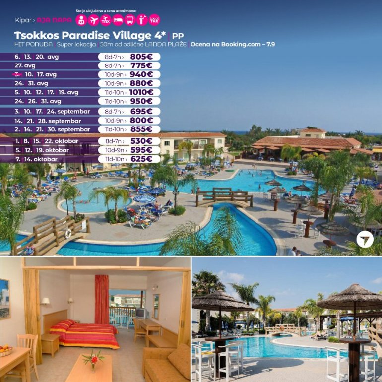 Ово одмаралиште са 4 звездице налази се у летовалишту Аја Напа. Нуди затворени базен, фитнес центар, сауну и отворени базен неправилног облика, окружен намештеном терасом за сунчање. Садржаји одмаралишта Tsokkos Paradise такође обухватају ресторан-бар поред базена, играоницу са билијаром, тениски терен и мини-маркет.