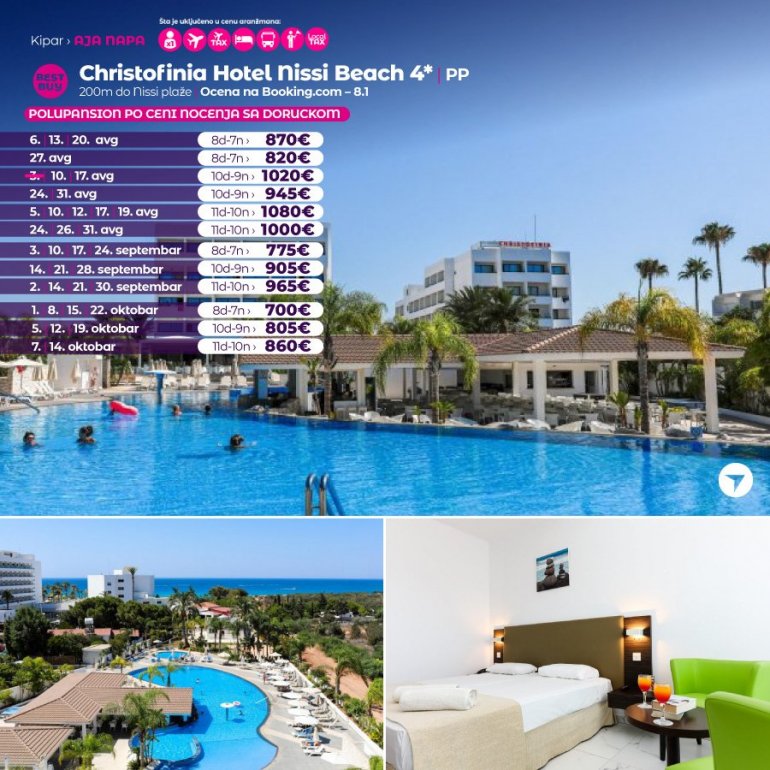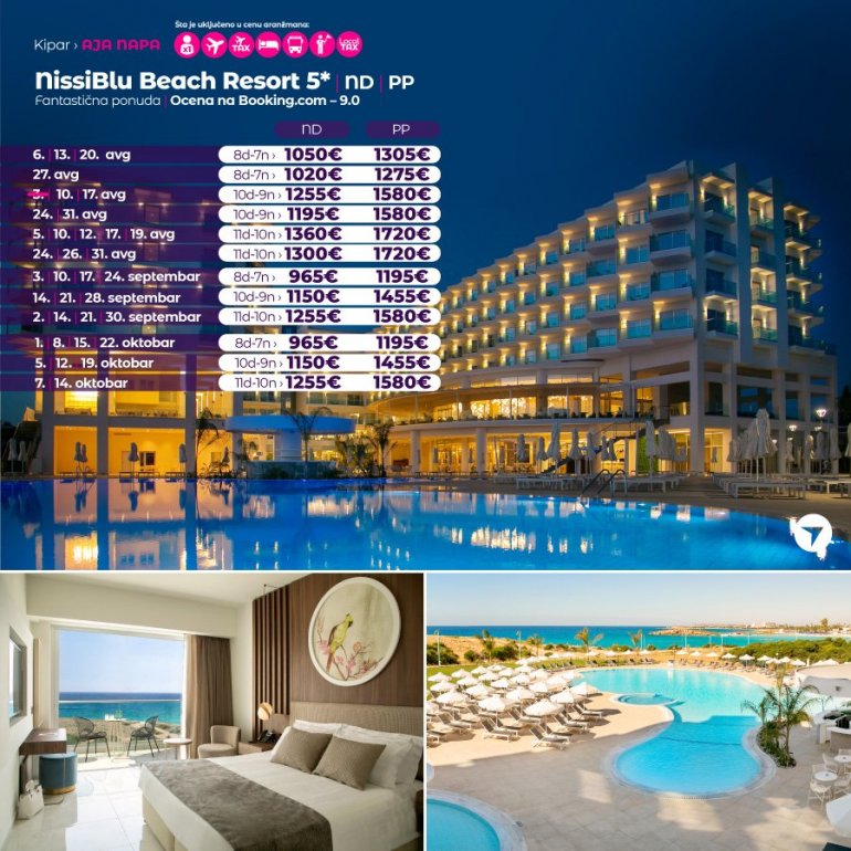 Nissiblu је нов, луксузан хотел, отворен пред сезону 2019 год. Налази се у лагуни Ниси плаже, најпознатије плаже у Аја Напи, на око 2 км од центра града. После само једне сезоне пословања, хотел је врло високо оцењен на туристичким порталима. Похвале од стране задовољних клијената се, осим савршене локације, односе и на изванредну храну, атмосферу, удобне собе и љубазно, стручно особље. Хотел је препорука наше агенције како за парове, тако и за породице са децом.