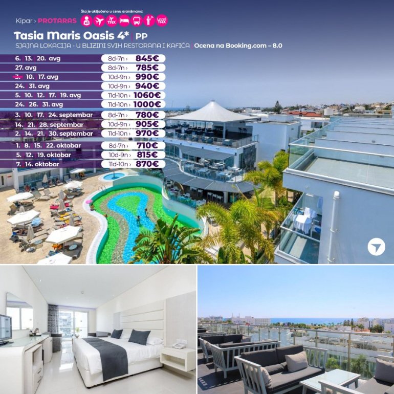 Смештен на падини, на само 5 минута хода од центра Аја Напе, објекат Tasia Maris Oasis нуди модерно уређене смештајне јединице са бесплатним бежичним интернетом и сопственим балконом. Укључује базен слободног облика, 2 ресторана и 2 бара. Грчка плажа, највећа пешчана плажа у Аја Напи, удаљена је само 10 минута хода. На пешачкој удаљености налазе се ресторани, барови и продавнице. Паркинг у оквиру објекта може се бесплатно користити.