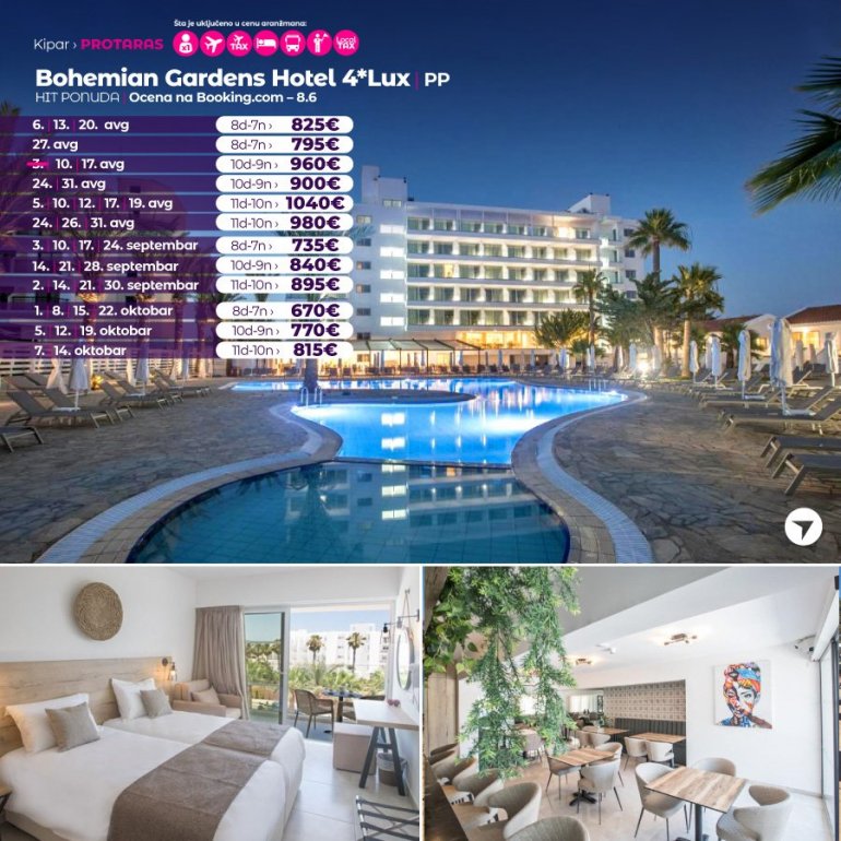 Хотел је смештен у близини Marlita Bay, у делу Протараса који се зове Пернера – један од најживљих делова овог града. Bohemian Gardens Hotel са 4* је зграда са 5 спратова, са 133 собе и 8 бунгалова. Хотел је отворен у јулу 2020. године и уређен је у бохо стилу.