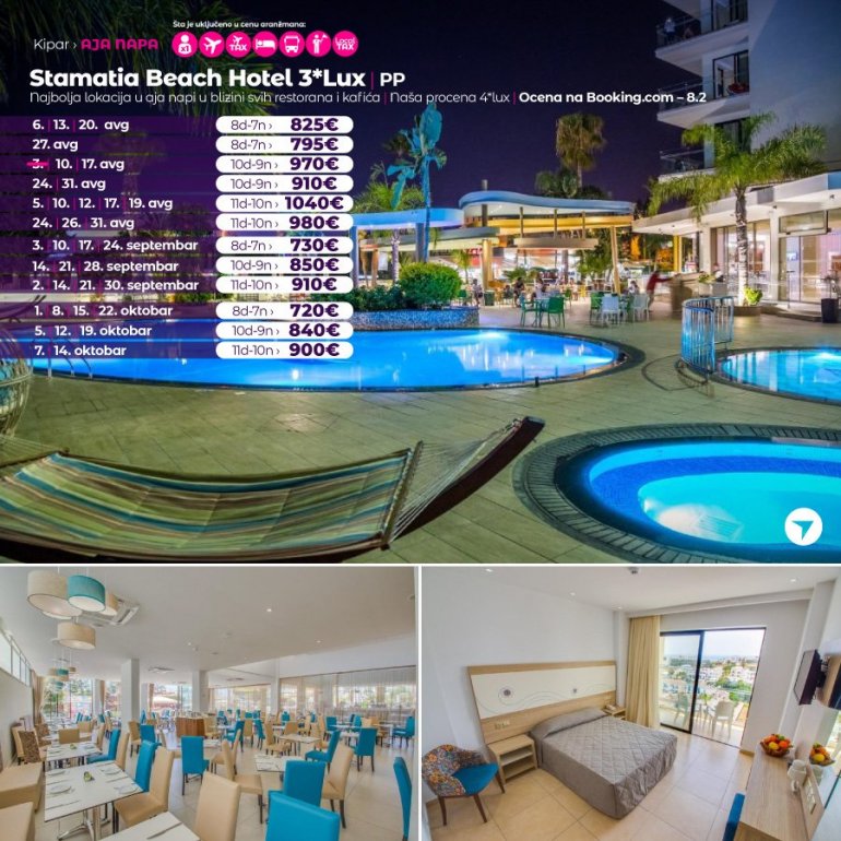 Овај објекат је удаљен 2 мин хода од плаже. Хотел Stamatia је удаљен само 100 метара од забавног парка у Аја Напи и плаже Аја Напа. Овај хотел са 3 звездице нуди велики базен, трпезарију на отвореном и собе са сопственим купатилом. Све климатизоване собе имају балкон, а поједине нуде поглед на море.