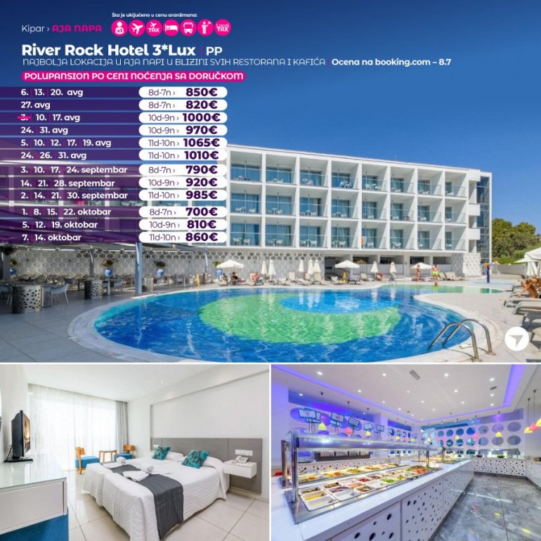 Хоте River Rock налази се у месту Аја Напа и поседује отворени базен и терасу за сунчање. На располагању је дечије игралиште, а бесплатан бежични интернет је доступан у целом објекту. Све собе нуде балкон са погледом на град. Поред тога садрже flat-screen ТВ и клима-уређај. Гостима је на располагању сопствено купатило са тушем и феном за косу. Додатне погодности укључују сеф, фрижидер и постељину. Понуда хотела River Rock укључује рецепцију која ради нон-стоп, врт и бар.