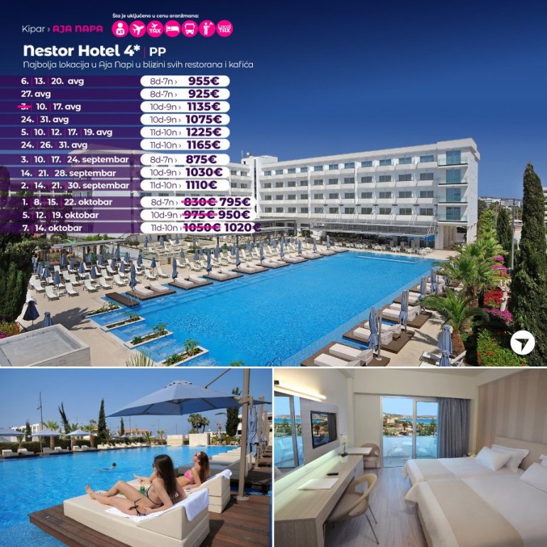 Модеран и у потпуности реновиран хотел Нестор, одлично је позициониран на само неколико минута шетње до прелепе пешчане плаже, марине и центра Аја Напе. Високо је оцењен на туристичким потралима и добитник је престижне плакете за висок квалитет услуге. Хотел од садржаја има: велики спољашњи базен са масажерима, унутрашњи базен, теретану, сауну, парно купатило, стони тенис, тениски терен, билијар, фризерски салон, дневну и вечерњу анимацију за одрасле, садржаје за децу – базен, авантура парк, ране оброке, анимацију, мини клуб. Собе су модерно опремљене, климатизоване, имају радио, фен, телефон, САТ ЛЦД ТВ, фрижидер, сеф, апарат за чај и кафу, wi-fi интернет (доступан и бесплатан у целом хотелу).