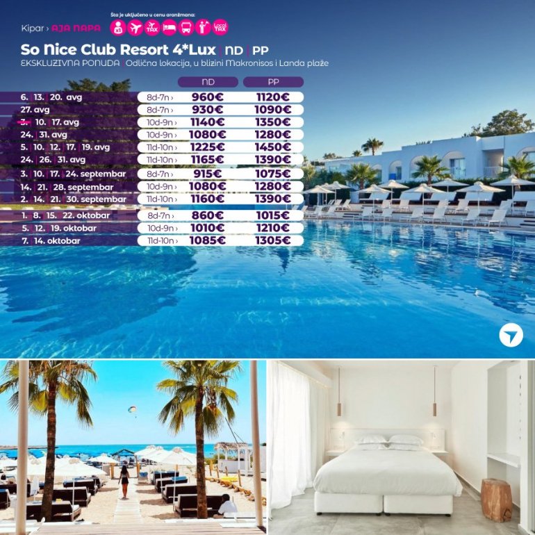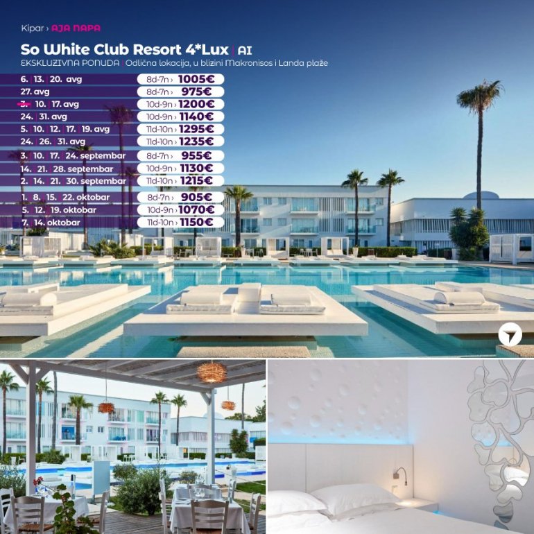 Објекат So White Club Resort налази се на предивној Златној плажи у летовалишту Аја Напа. У понуди су базен у стилу лагуне са плутајућим лежаљкама и награђивани ресторан. Овај бутик хотел у Аја Напи је дизајнирао један од најбољих 50 дизајнера на свету. Поред задивљујућих тропских вртова налази се потпуно бео базен, који може мењати боје, са јединственим ефектом неба у позадини. На плажи су доступни спортови на води, гњурање и роњење. Космополитски центар ноћног живота Аја Напе налази се на само 3,5 км од хотела и до њега се лако и брзо стиже аутобусом и таксијем.