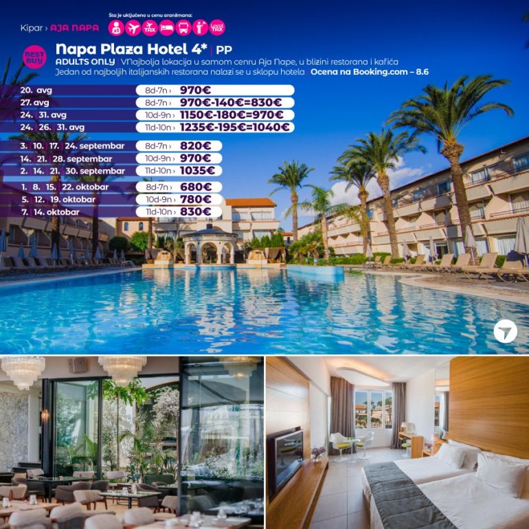 Ово је модеран и атрактиван хотел са четири звездице у срцу Аја Напе. Намењен је само одраслим гостима, а изграђен је 1989. године у близини средњовековног манастира. Овај централно лоцирани савремени и јединствени хотел који је саграђен у стилу трга нуди гостима приватност, префињеност и персонализовану услугу, што се и очекује од вишеструко награђиваног софистицираног окружења прилагођеног одраслима. Хотел је удаљен 7 минута хода од најближе градске плаже, километар од популарне Grecian bay плаже, 3 км од Nissi плаже и 4,5 км до Waterworld воденог парка. Објекат се налази у самом центру Аја Напе, окружен продавницама, кафићима и ресторанима. Аутобуска станица и стари Манастир су у непосредној близини, а недалеко су и музеј Thalassa, подводни музеј Musan, парк скулптура и кактуса.
