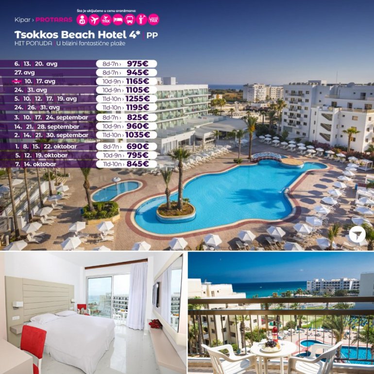 На само 150 м од плаже, у центру Протараса, налази се хотел Tsokkos Beach. Окружен је многобројним ресторанима, продавницама и баровима, а пешачка стаза уз море пролази испред хотела. Осим главног ресторана, у коме се служе оброци по принципу шведског стола, хотел има и кафетрију, бар на базену, базен за одрасле, базен за децу, салу за видео игрице, теретану, анимацију током дана и вечери, тениски терен. Све собе су модерно опремљене, уз доплату је бежични интернет, коришћење електронског сефа и мини фрижидера.