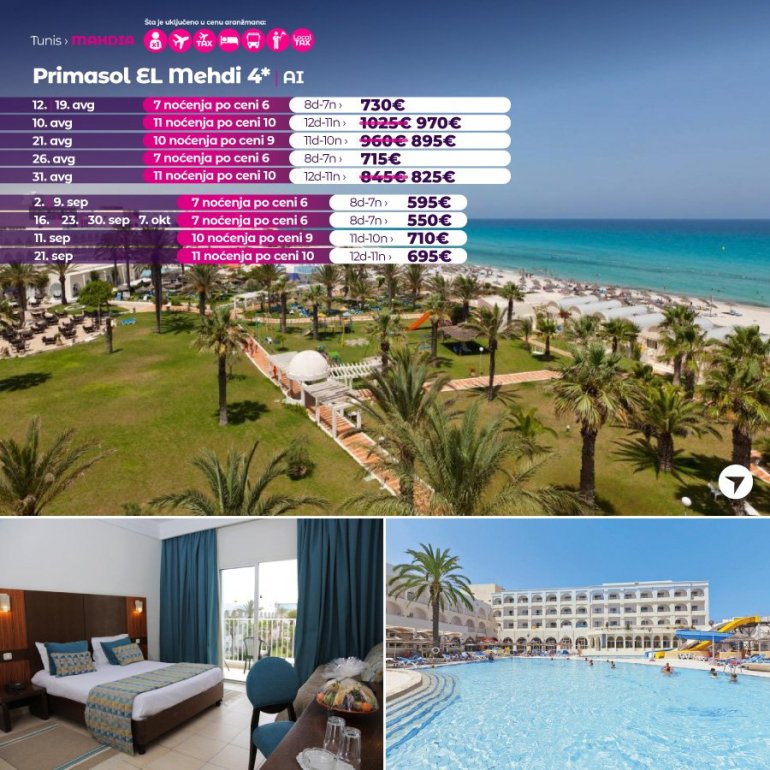 All-inclusive хотел Primasol El Mehdi се налази на 2 км од центра Махдије и на 50 метара од приватне плаже, са директним прилазом из хотела. Хотел је на одличној локацији, у близини старог дела града. У склопу хотела налазе се четири отворена базена и један затворени. За најмлађе ту је базен са неколико тобогана. Гости могу да уживају уз одбојка на песку, аеробик, fitness. Хотел поседује спа и wellness који се доплаћују. Хотел има своју плажу. Сунцобрани, лежаљке и пешкири су бесплатни за коришћење.