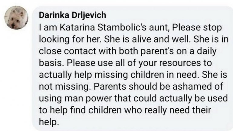 - Ја сам тетка Катарине Стамболић. Молим вас да престанете да је тражите. Она је жива и здрава. Сваки дан је у блиском контакту са оба родитеља. Молим вас, искористите своје ресурсе да стварно помогнете несталој деци којој је потребна помоћ. Она није нестала. Родитељи би требало да се стиде што користе ресурсе који би могли да буду коришћени да помогну у проналажењу деце којој заиста треба помоћ - написала је Даринка.