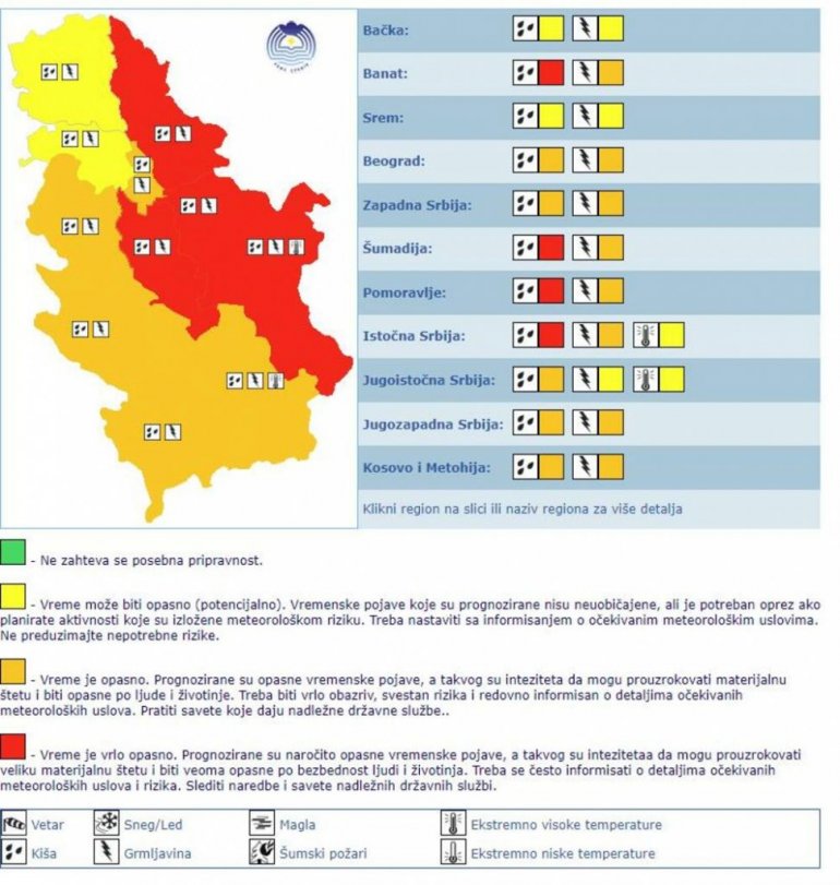 "Прогнозиране су нарочито опасне временске појаве, а таквог су интензитета да могу проузроковати велику материјалну штету и бити веома опасне по безбедност људи и животиња. Треба се често информисати о детаљима очекиваних метеоролошких услова и ризика. Следити наредбе и савете надлежних државних служби", објавио је РХМЗ.