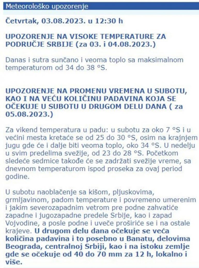 "За викенд температура у паду: у суботу за око 7°C и у већини места кретаће се од 25 до 30°C, осим на крајњем југу где ће и даље бити веома топло, око 34°C. У недељу у свим пределима свежије, од 23 до 28°С. Почетком следеће седмице такође ће се задржати свежије време, са дневном температуром испод просека за овај период године. У суботу наоблачење са кишом, пљусковима, грмљавином, падом температуре и повремено умереним и јаким северозападним ветром пре подне захватиће западне и југозападне пределе Србије, као и запад Војводине, а после подне и увече прошириће се и на остале крајеве. У другом делу дана очекује се већа количина падавина и то посебно у Банату, деловима Београда, централној Србији, као и на истоку земље где се очекује од 40 до 70 мм за 12 h, локално и више", стоји у упозорењу које је РХМЗ објавио данас у 12.30 сати.