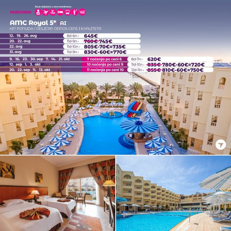 Смештен на самој плажи у Хургади, хотел AMC Royal налази се у области Алахја. Поседује приватну плажу и велики избор садржаја за спортове на води, укључујући роњење и гњурање.