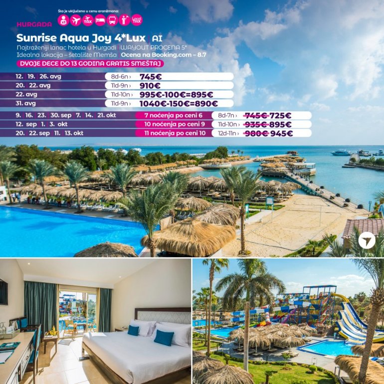 Породични хотел који нуди 6 базена на отвореном, садржаје за паркинг и коришћење приватне плаже, а налази се поред плаже у Хургади. Понуда објекта Aqua Joy Resort- by SUNRISE укључује интернационалне, италијанске, азијске, египатске, грчке и ресторане који служе јела од морских плодова. У објекту се налази и 5 барова, укључујући шиша бар. Садржаји хотела обухватају аква-парк, теретану, спа центар и козметички салон.