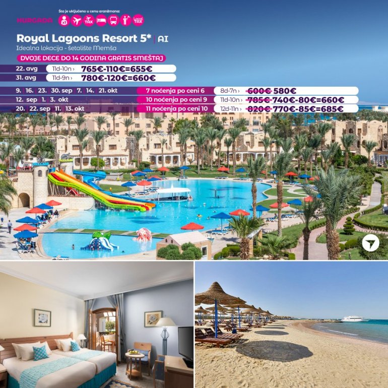 На само 5 минута од аеродрома у Хургади, уживајте у величанственој хармонији Црвеног мора и природе.Налази се на новом шеталишту Хургаде, на сопственој пешчаној плажи. Свака соба има терасу или балкон, сеф, мини бар, клима уређај, две телефонске линије, сат тв, апарат за чај и кафу, фен и прибор за шивење. У оквиру хотела је неколико ресторана са интернационалном кухињиом и барова. Ту су још и три базена и један за децу, спа центар, фитнес центар, терен за тенис, стони тенис, билијар, одбојка на песку, анимација, клуб за децу од 4 до 12 година... У оквиру хотела је и мали шопинг центар са златарама, гифт шоповима, продавницама сувенира, парфимерија, фризерски салон, татоо салон и банка.