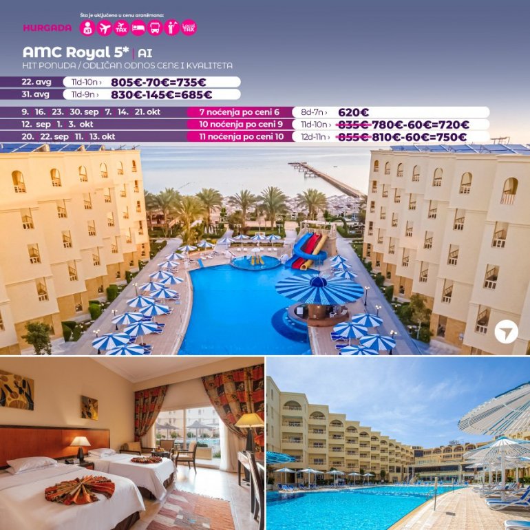 Смештен на самој плажи у Хургади, хотел AMC Royal налази се у области Алахја. Поседује приватну плажу и велики избор садржаја за спортове на води, укључујући роњење и гњурање.