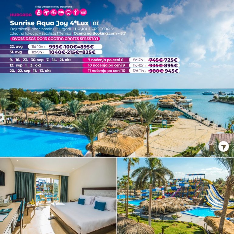 Породични хотел који нуди 6 базена на отвореном, садржаје за паркинг и коришћење приватне плаже, а налази се поред плаже у Хургади. Понуда објекта Аqуа Јоy Ресорт- бy СУНРИСЕ укључује интернационалне, италијанске, азијске, египатске, грчке и ресторане који служе јела од морских плодова. У објекту се налази и 5 барова, укључујући шиша бар. Садржаји хотела обухватају аква-парк, теретану, спа центар и козметички салон.
