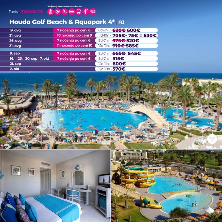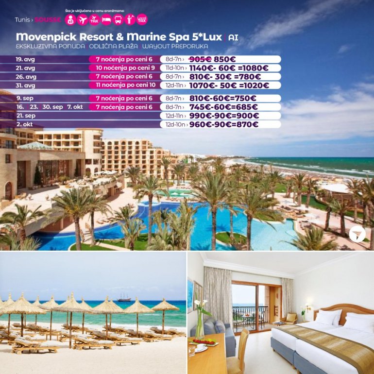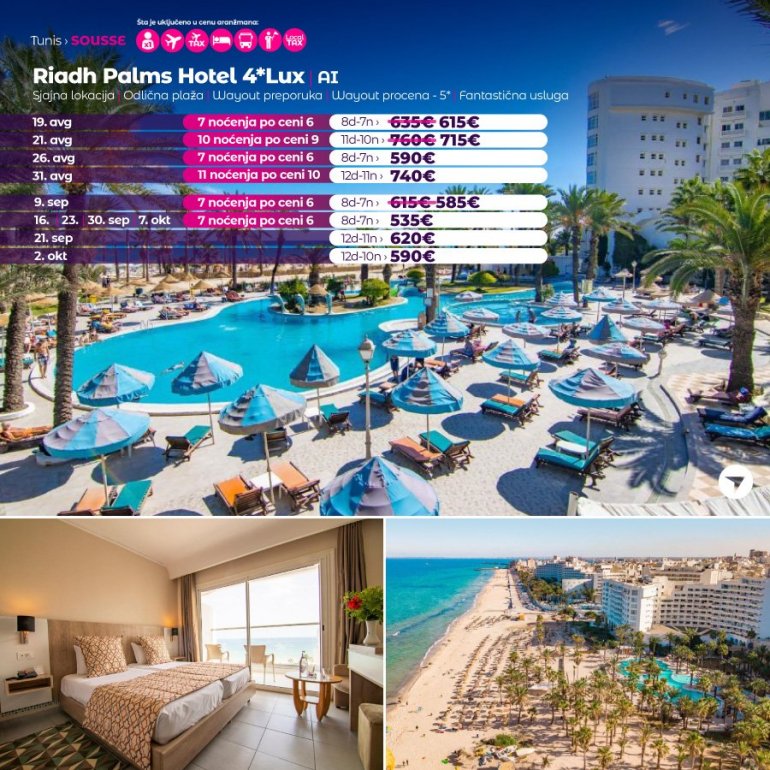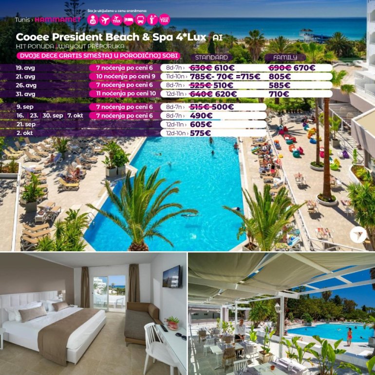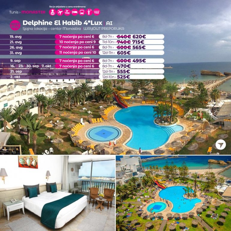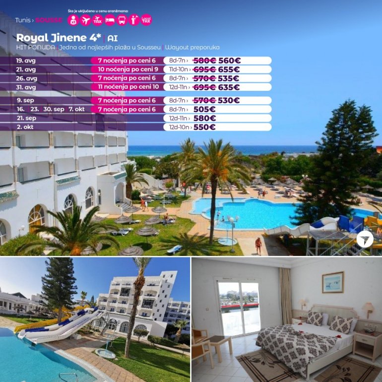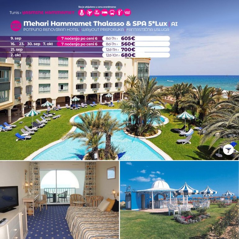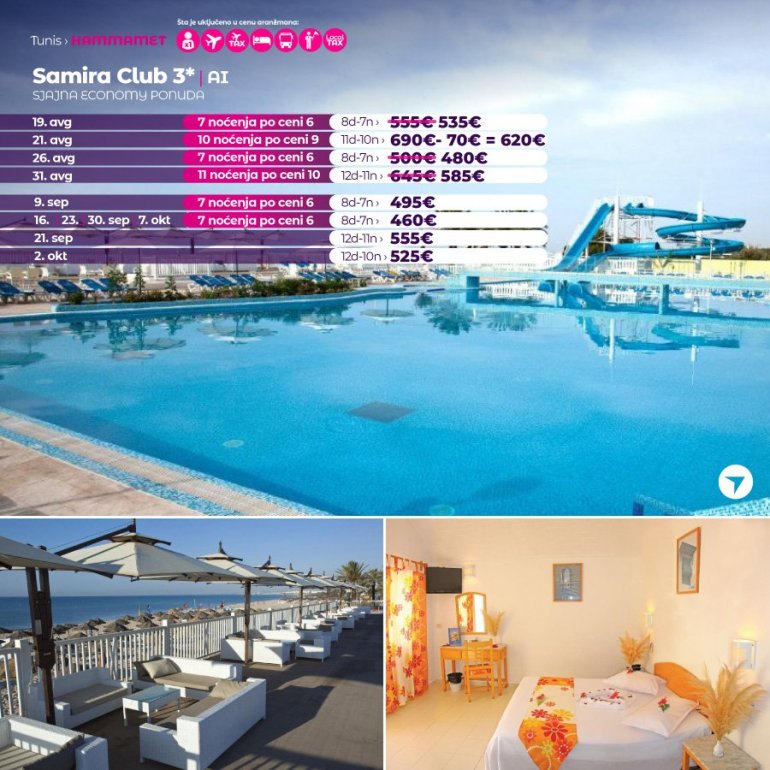 Искључиво са AirSerbia у Тунис! 7 ноћења по цени 6 ноћења / 10 ноћења по цени 9 ноћења / 11 ноћења по цени 10 ноћења. Издвајамо из понуде најтраженије хотеле за лето 2023: