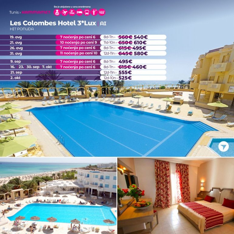 Les Colombes је хотел са 3* који је смештен у Hammametu, у туристичкој зони. Хотел се налази на 15мин од Неаполис музеја. За госте је доступна теретана. У објекту је доступна рецепција 24х. За најмлађе госте ту је клуб за децу. Поред плаже, гости могу да уживају и на спољном базену.Хотел излази на своју плажу.Свака соба у хотелу је климатизована, има своје купатило и мини бар.Код рецепције се налази лоббy бар. Оброци из услуге Алл инцлусиве се служе у главном ресторану.