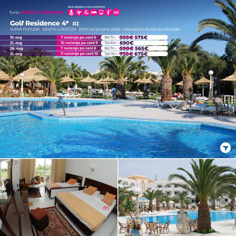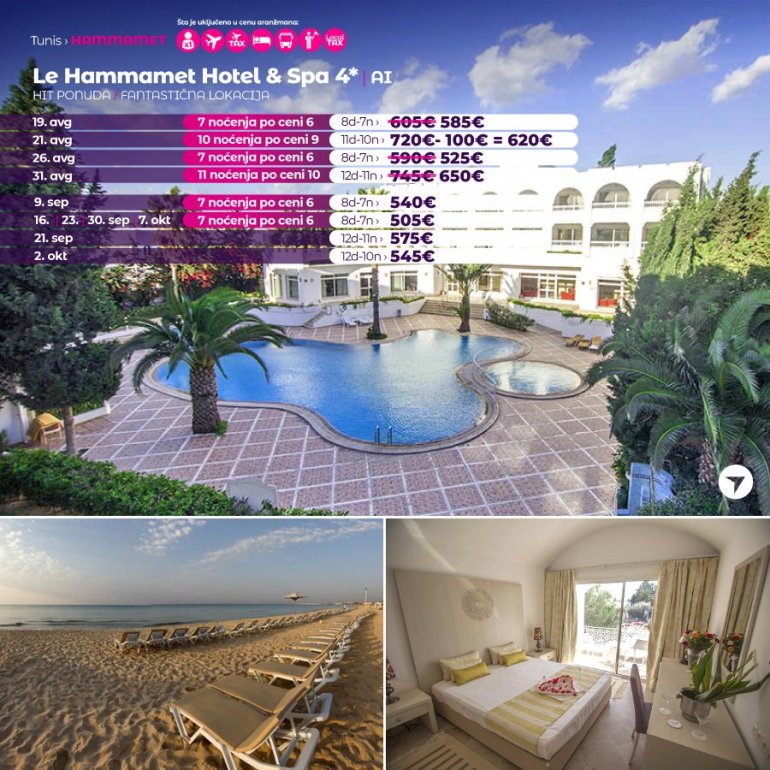 Хотелски комплекс је удаљен 300м од пешчане плаже (улица дели хотел од плаже), 100м од aqua парка (улаз уз доплату), 5км од центра Хамамета, 60км од аеродрома у Тунису, 85км од аеродрома у Монастиру. Хотел располаже са 215 соба у главној згради и 150 бунгалова у Tunisian Village комплексу-у оквиру хотела. Хотел има 2 ресторана, 3 бара, 2 отворена базена са делом за децу, мини клуб, масажу, билијар, стони тенис, мини голф, терен за тенис, мењачницу. Коришћење пешкира крај базена уз обавезан депозит. Свака соба има купатило, терасу, климу, фен за косу. Могућност најма сефа-уз доплату. Исхрана је на бази шведског стола-самопослуживање.