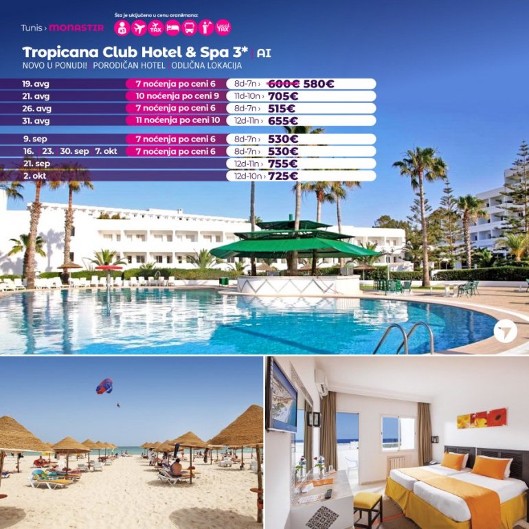 Хотел Tropicana club and SPA је породичан хотел идеално лоциран. Налази се на плажи, 3км од аеродрома у Монастиру и 10км од Суса. У склопу хотела су 2 главна базена са тобоганима који су отворени до 19х. Хотел излази на своју пешчану плажу. За узраст од 4 до 11 година ту је мини цлуб.