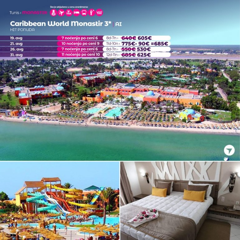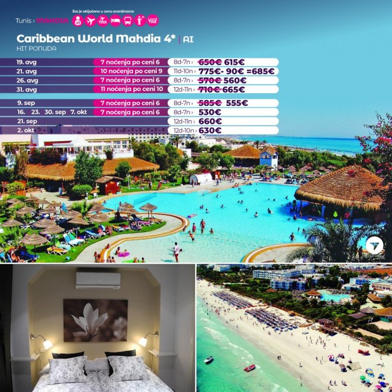 Caribbean World хотел смештен је у летовалишту са најлепшим плажама – Махдиа. Од аеродрома у Монастиру удаљен је око сат времена и има своју плажу. Собе су стандардно опремљене, климатизоване са сопственим купатилом и балконом/терасом. У склопу хотела је спољни и унутрашњи базен. Хотел поседује ресторан и бар. Дечији клуб намењен за најмлађе је доступан. Fitness студио и теретана су такође доступни.