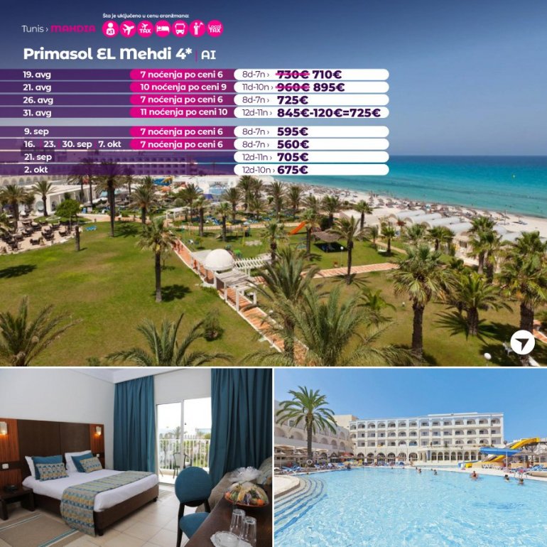 All-inclusive хотел Primasol El Mehdi се налази на 2 км од центра Махдије и на 50 метара од приватне плаже, са директним прилазом из хотела. Хотел је на одличној локацији, у близини старог дела града. У склопу хотела налазе се четири отворена базена и један затворени. За најмлађе ту је базен са неколико тобогана. Гости могу да уживају уз одбојка на песку, аеробик, fitness. Хотел поседује спа и wellness који се доплаћују. Хотел има своју плажу. Сунцобрани, лежаљке и пешкири су бесплатни за коришћење.