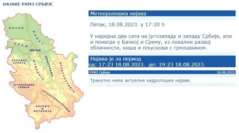 - У наредна два сата на југозападу и западу Србије, али и понегде у Бачкој и Срему, уз локални развој облачности, киша и пљускови с грмљавином - пише у најави.