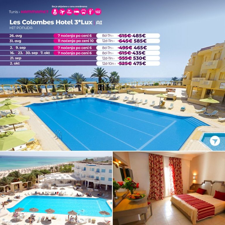 Les Colombes је хотел са 3* који је смештен у Hammametu, у туристичкој зони. Хотел се налази на 15мин од Неаполис музеја. За госте је доступна теретана. У објекту је доступна рецепција 24х. За најмлађе госте ту је клуб за децу. Поред плаже, гости могу да уживају и на спољном базену.Хотел излази на своју плажу.Свака соба у хотелу је климатизована, има своје купатило и мини бар.Код рецепције се налази lobby бар. Оброци из услуге All inclusive се служе у главном ресторану.
