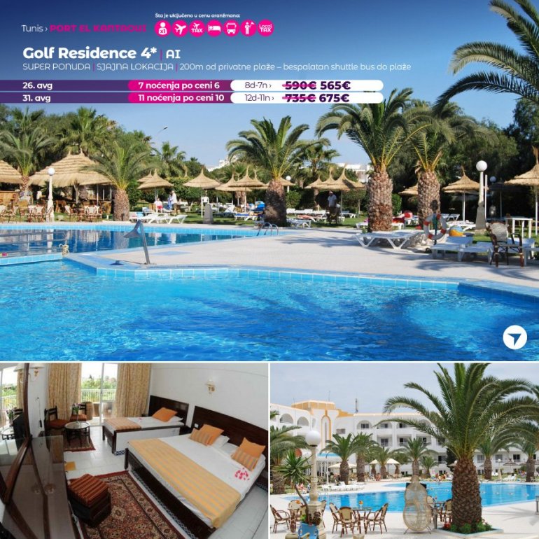 Golf Residence се налази на 500м од марине и на 400м од приватне плаже. Хотел има ресторан, бар, кафић, аперитив бар, поол снацк бар , дискотеку, теретану, отворени базен, дечији базен, козметички салон, fitness салу, сауну, jacuzzi, health club, масажу, фризерски салон, 2 тениска терена, дечије игралиште, играоницу, и дечији мини клуб, сеф на рецепцији, мењачницу, rent-a-car, лифт, услугу прања веша, бутике и продавнице, мини маркет и internet caffe.