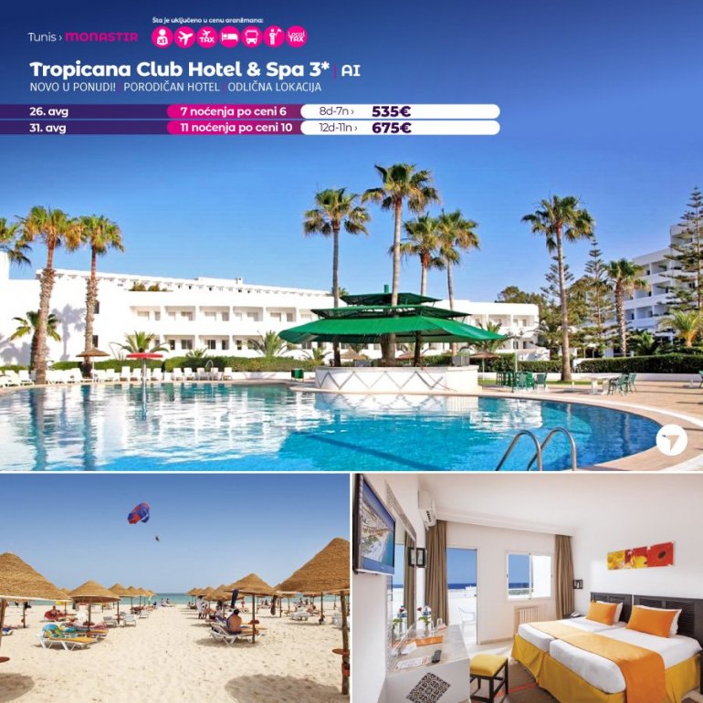 Хотел Tropicana club анд СПА је породичан хотел идеално лоциран. Налази се на плажи, 3км од аеродрома у Монастиру и 10км од Суса. У склопу хотела су 2 главна базена са тобоганима који су отворени до 19х. Хотел излази на своју пешчану плажу. За узраст од 4 до 11 година ту је мини цлуб.