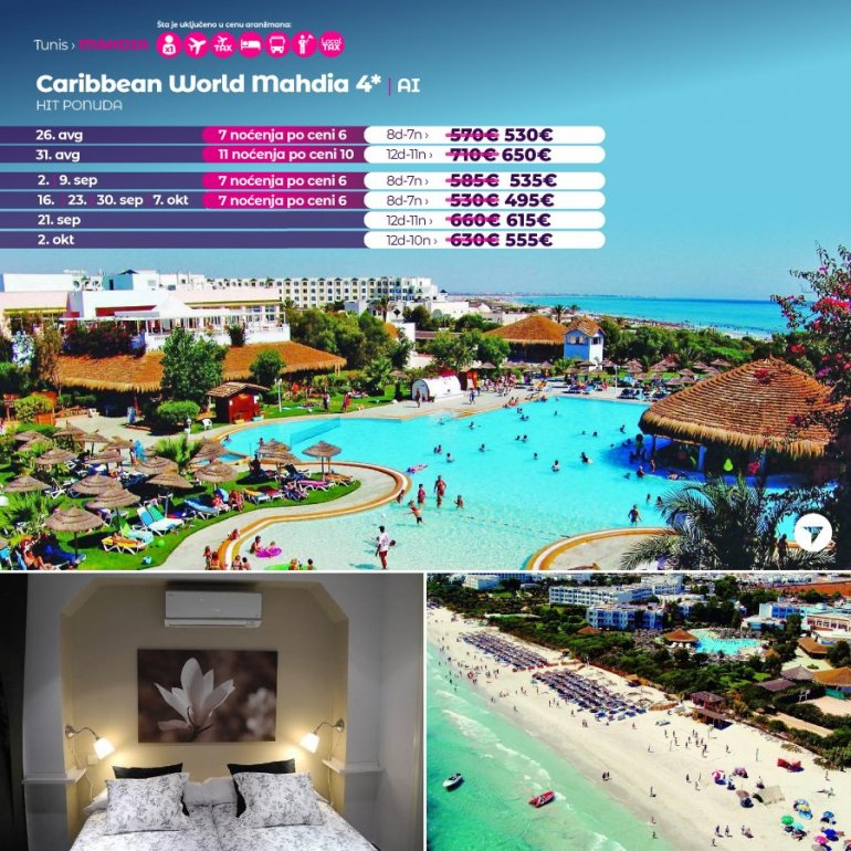 Caribbean World хотел смештен је у летовалишту са најлепшим плажама – Mahdia. Од аеродрома у Монастиру удаљен је око сат времена и има своју плажу. Собе су стандардно опремљене, климатизоване са сопственим купатилом и балконом/терасом. У склопу хотела је спољни и унутрашњи базен. Хотел поседује ресторан и бар. Дечији клуб намењен за најмлађе је доступан. Fitness студио и теретана су такође доступни.
