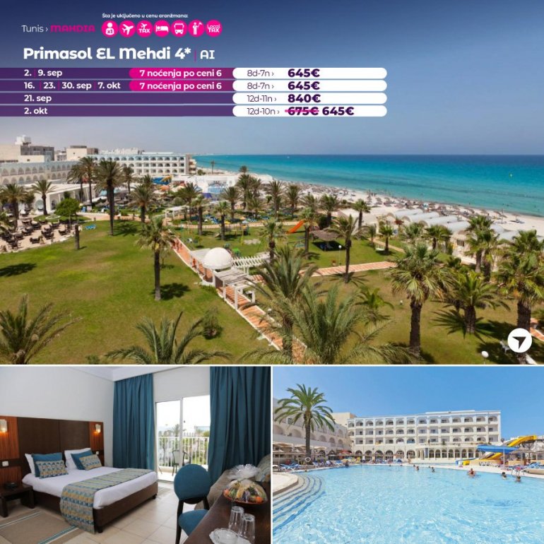 All-inclusive хотел Primasol El Mehdi се налази на 2 км од центра Махдије и на 50 метара од приватне плаже, са директним прилазом из хотела. Хотел је на одличној локацији, у близини старог дела града. У склопу хотела налазе се четири отворена базена и један затворени. За најмлађе ту је базен са неколико тобогана. Гости могу да уживају уз одбојка на песку, аеробик, fitness. Хотел поседује спа и wеллнесс који се доплаћују. Хотел има своју плажу. Сунцобрани, лежаљке и пешкири су бесплатни за коришћење.
