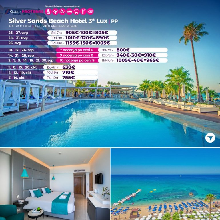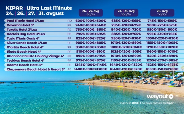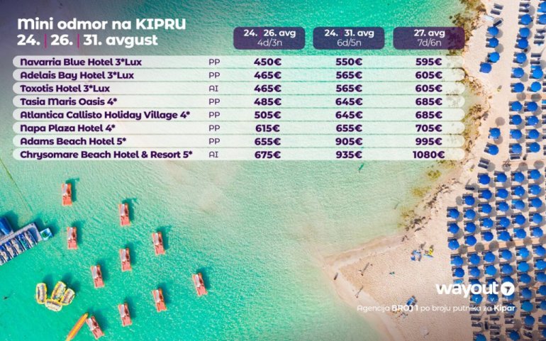 Дефинитивно нова омиљена летња дестинација наших туриста, свакако јесте рајско острво Кипар. Осетите чари Медитерана, фантастичних плажа, веома квалитетних хотела, изузетне гастрономске понуде, као и незаборавног ноћног провода. За наше путнике смо спремили одличну фирст минуте понуду са пажљиво изабраним хотелима, како на основу пређашњих искустава наших клијената, тако и на основу одличних оцена на туристичким порталима.