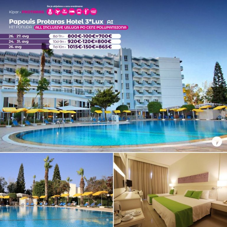 Одличан хотел, лоциран недалеко од центра Протараса, на најлепшем делу дугачке пешчане плаже. Од садржаја хотел има ресторан, бар, спољашњи базен, дечији базен, тениски терен, теретану, анимацију током дана и вечери, музички програм. Све собе су климатизоване, имају ТВ, фен, телефон, а уз доплату могу се користити фрижидер, сеф и wи-фи интернет.