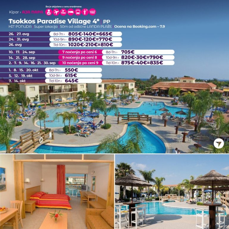 Ово одмаралиште са 4 звездице налази се у летовалишту Аја Напа. Нуди затворени базен, фитнес центар, сауну и отворени базен неправилног облика, окружен намештеном терасом за сунчање. Садржаји одмаралишта Тсоккос Парадисе такође обухватају ресторан-бар поред базена, играоницу са билијаром, тениски терен и мини-маркет.