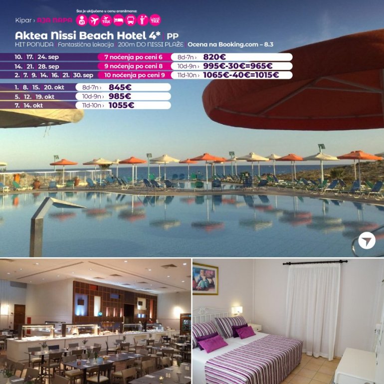 Модеран и у потпуности реновиран хотел Нестор, одлично је позициониран на само неколико минута шетње до прелепе пешчане плаже, марине и центра Аја Напе. Високо је оцењен на туристичким потралима и добитник је престижне плакете за висок квалитет услуге. Хотел од садржаја има: велики спољашњи базен са масажерима, унутрашњи базен, теретану, сауну, парно купатило, стони тенис, тениски терен, билијар, фризерски салон, дневну и вечерњу анимацију за одрасле, садржаје за децу – базен, авантура парк, ране оброке, анимацију, мини клуб. Собе су модерно опремљене, климатизоване, имају радио, фен, телефон, САТ ЛЦД ТВ, фрижидер, сеф, апарат за чај и кафу, wи-фи интернет (доступан и бесплатан у целом хотелу).