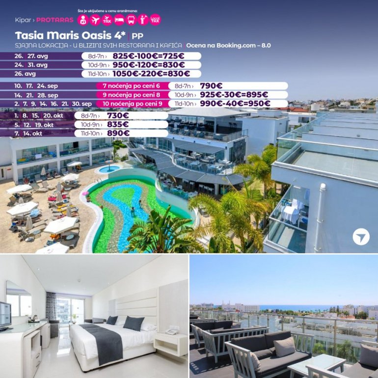Смештен на падини, на само 5 минута хода од центра Аја Напе, објекат Тасиа Марис Оасис нуди модерно уређене смештајне јединице са бесплатним бежичним интернетом и сопственим балконом. Укључује базен слободног облика, 2 ресторана и 2 бара. Грчка плажа, највећа пешчана плажа у Аја Напи, удаљена је само 10 минута хода. На пешачкој удаљености налазе се ресторани, барови и продавнице. Паркинг у оквиру објекта може се бесплатно користити.
