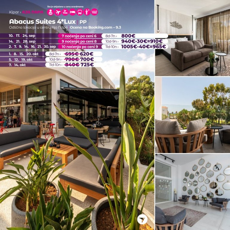 Abacus Suites 4*lux је потпуно нов хотел, са највишим оценама на туристичким порталима. Изузетно је лоциран, на неколико минута хода од центра Аја Напе и плаже. У непосредној близини хотела налазе се ресторани, кафићи, барови, продавнице и станица градског превоза. Идеалан је избор како за парове, тако и за породице, због пространих соба и услуге која може бити полупансион или all incslusive.
