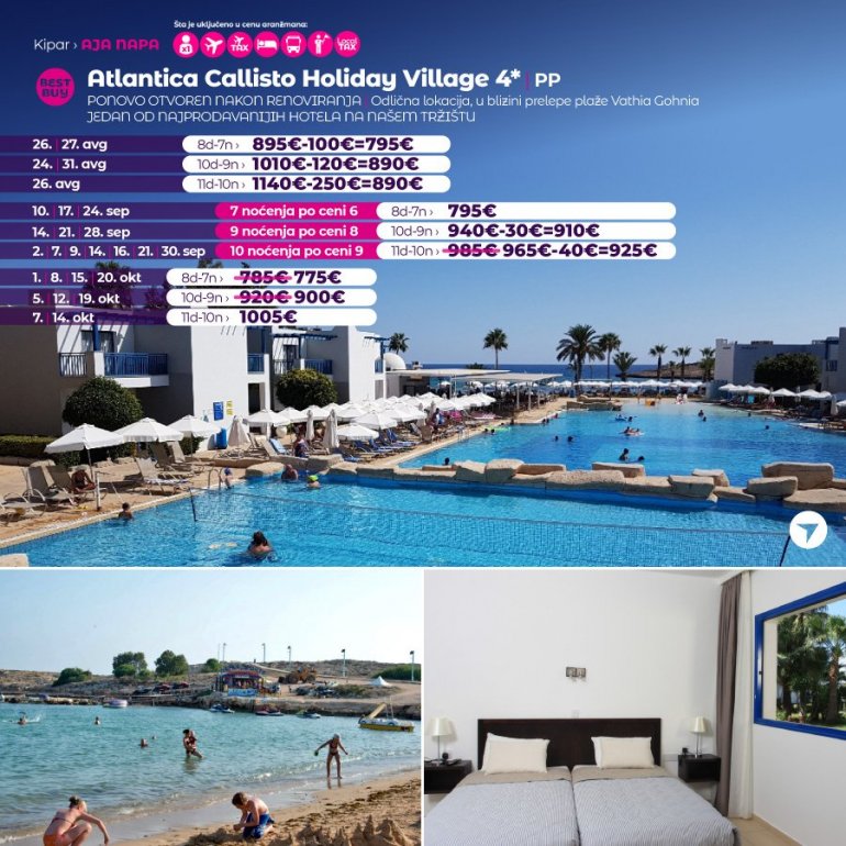 Callisto је комплекс осмишљен као копија традиционалног медитеранског села са белим двоспратним вилама плавих шалона, прозора и врата. Виле су окружене егзотичним дрвећем и цвећем, повезане узаним стазама са централним делом хотела, у коме се налази ресторан, рецепција, безени и пролаз до прелепе пешчане плаже. Идеалан избор за породице са децом и све остале који уживају у раскошној природи, а на неколико минута хода од главне улице познатог летовалишта Аја Напа. Центар града удаљен је 1,5км. Бесплатан улаз у аква парк недалеко од хотела!