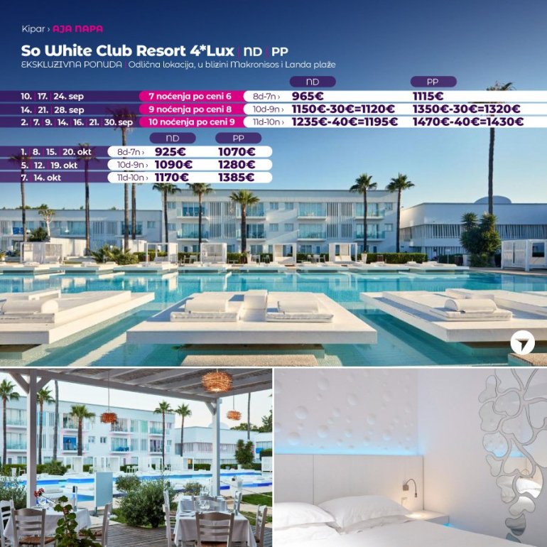 Објекат So White Club Resort 5* налази се на предивној Златној плажи у летовалишту Аја Напа. У понуди су базен у стилу лагуне са плутајућим лежаљкама и награђивани ресторан. Овај бутик хотел у Аја Напи је дизајнирао један од најбољих 50 дизајнера на свету. Поред задивљујућих тропских вртова налази се потпуно бео базен, који може мењати боје, са јединственим ефектом неба у позадини. На плажи су доступни спортови на води, гњурање и роњење. Космополитски центар ноћног живота Аја Напе налази се на само 3,5 км од хотела и до њега се лако и брзо стиже аутобусом и таксијем.