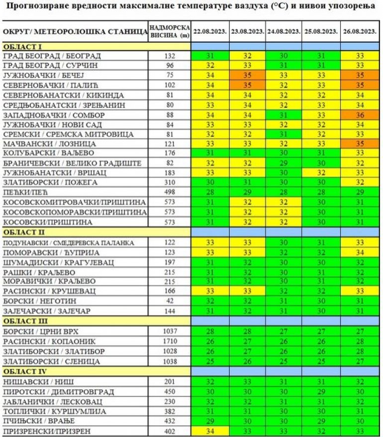 - Прогнозиране вредности максималне дневне температуре ваздуха биће у категорији опасне појаве 23. августа на територији севернобачког и јужнобачког округа, као и 26. и 27. августа у већем делу северне Србије, колубарском и мачванском округу. У периоду од 22. до 27. августа максималне дневне температуре ваздуха спадаће у домен потенцијално опасне појаве у северним деловима Србије, као и у појединим централним, западним и јужним крајевима - наводе из Института "Батут".