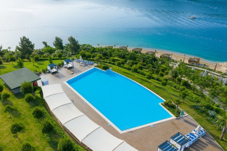 Хотел ће вас засигурно задивити својим пространством, на површини од 82.000 м2 - приватна плажа, отворени и затворени базени, бројни а ла царте ресторани, аква парк, спа центар, теретана…А тек за малишане, мини клуб, игралиште, дечији базени, прегршт анимација и активности. Док се они добро забављају на свој начин, а кад сте већ у Турској, ви не пропустите да употпуните одмор опуштањем на турски начин, у турском купатилу – хамаму, где ћете дух и тело припремити за потпуно уживање на егејској обали.